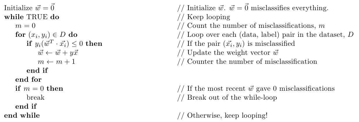 Given training data $ \{(\mathbf{x}_i, y_i)\}_{i=1}^N $, the Perceptron algorithm proceeds as follows: