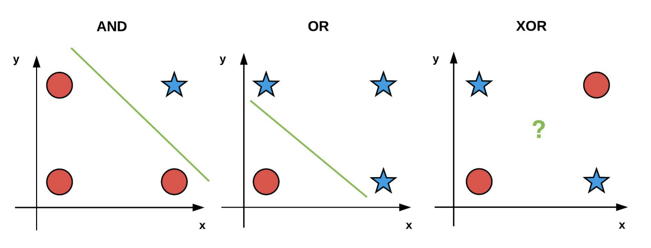 *Both AND and OR contain data that is linearly separable in 2D. However, the XOR problem is not linearly separable -- no single straight line can separate the positive and negative points.*
