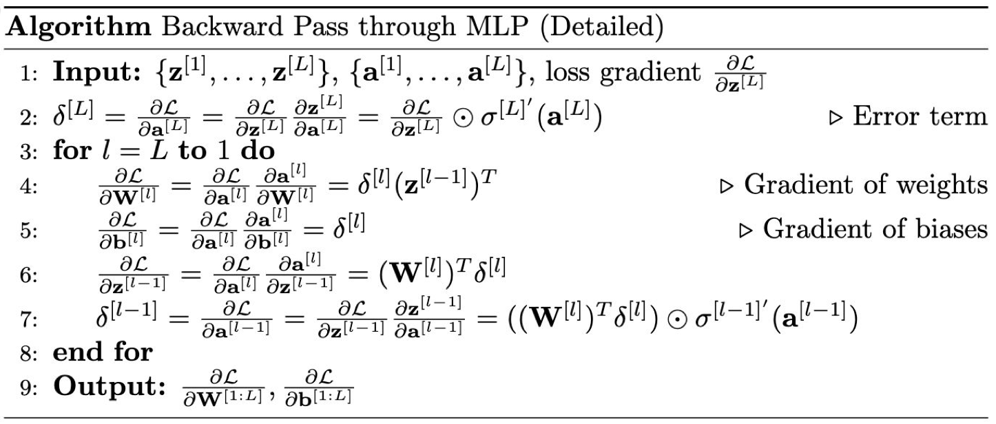 **Figure 3:** Backpropagation algorithm from the "Recap & Multi-Layer Perceptrons" lecture slides ([CS 4782, Cornell University, 2025](https://www.cs.cornell.edu/courses/cs4782/2025sp/slides/pdf/week1_2_slides_complete.pdf))