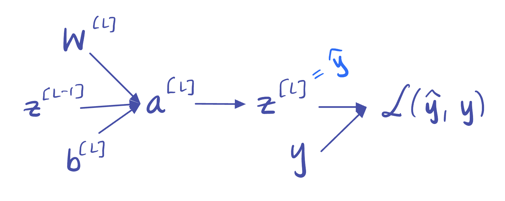 From our forward pass, we currently have $ \mathbf{z}^{[L]} $ (the output of the last layer $ L $), which is equivalent to our prediction $ \mathbf{\hat{y}} $. Thus, we can directly compute $ \frac{\partial \mathcal{L}}{\partial \mathbf{z}^{[L]}} $.