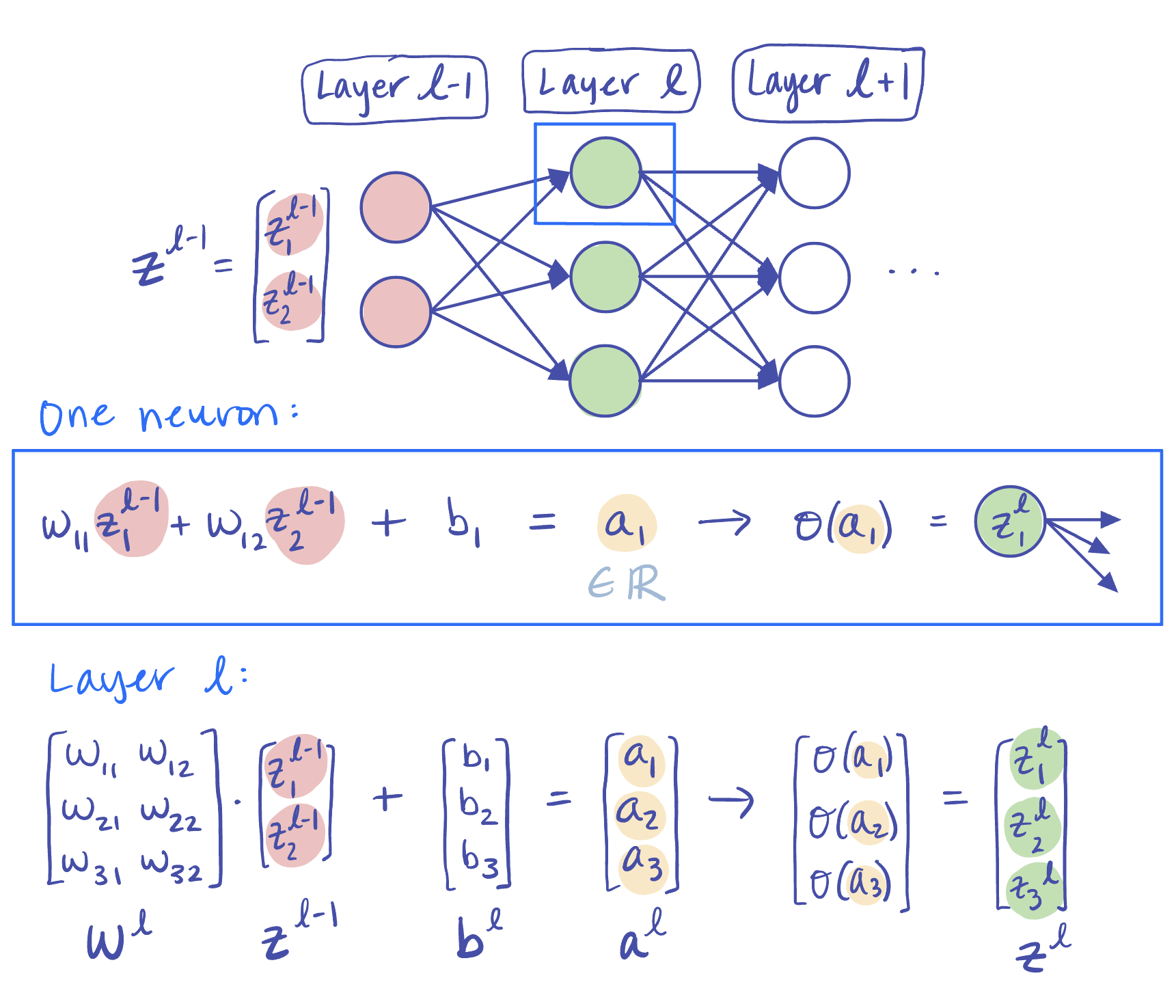 Below is an explanation of the notation we will adopt for the remainder of the notes. For each layer $ l \in \{1,2,...,L\} $ of an MLP with $ L $ total layers, we have the following: