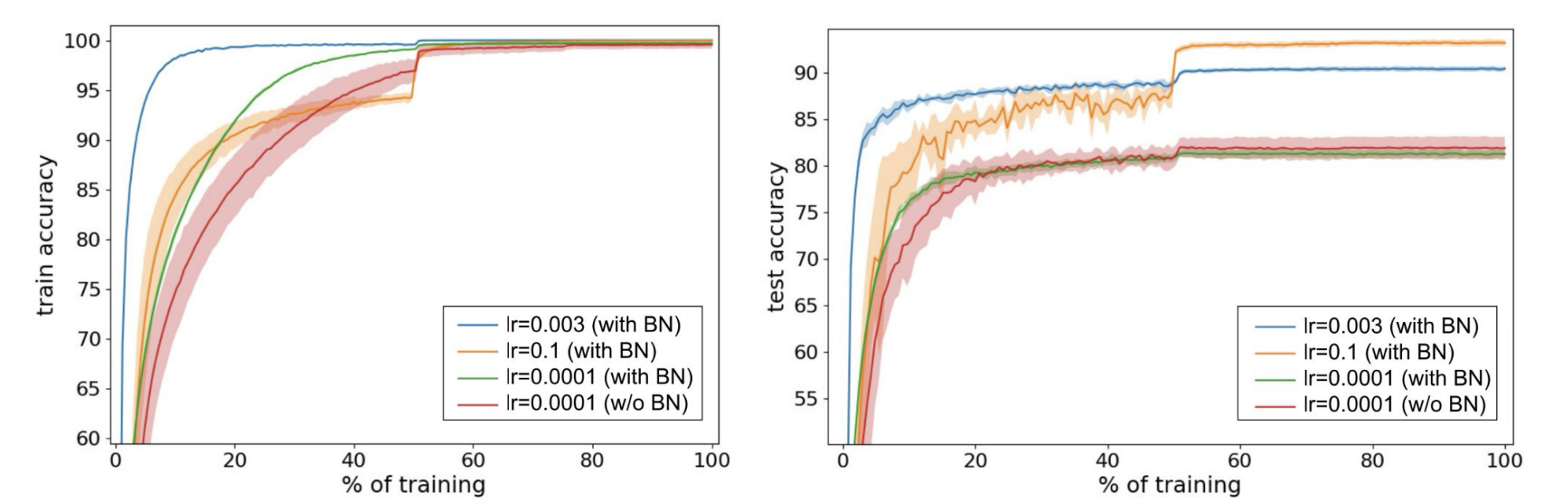 The above figure illustrates the regularizing characteristics that appear when BatchNorm is applied in conjunction with a larger learning rate. At small learning rates (green vs. red), the inclusion of BatchNorm layers does not have an impact on test accuracy (right). When we increase the learning rates (blue, orange), however, we see that test accuracy improves drastically by reducing overfitting and generalizing better to unseen data. This improvement is a direct effect of the larger learning rate that we were able to use by including BatchNorm layers in the network.