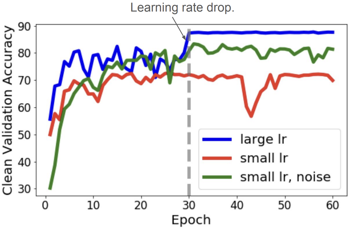 **Figure 8:** Validation accuracy when using a large learning rate, small learning rate, and a small learning rate + noise ([Li et. al., 2019](https://arxiv.org/abs/1907.04595))
