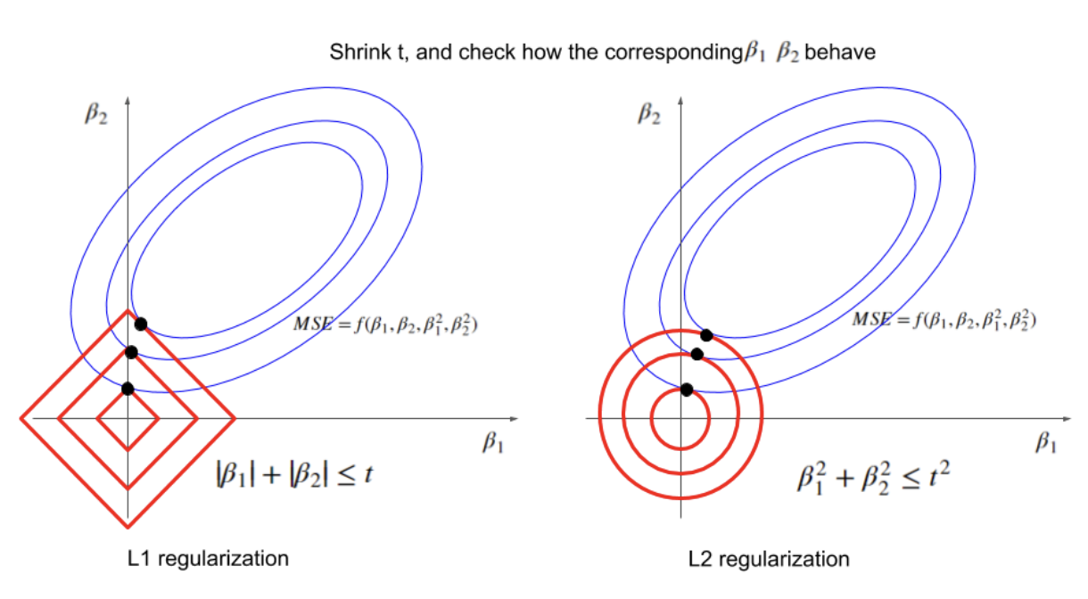 __Figure 3:__ Visualizing optimal values for parameters $ \beta_1 $ and $ \beta_2 $ under varying restrictions on $ t=r(\mathbf{\beta}) $. ([Xiaoli Chen, 2018](https://www.linkedin.com/pulse/intuitive-visual-explanation-differences-between-l1-l2-xiaoli-chen))