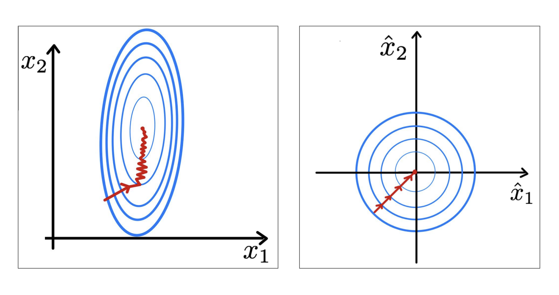 Consider a deep learning task that aims to predict house prices. Let $ x_1 $ be a feature representing bedroom number $ \in [1,5] $ and let $ x_2 $ be a feature representing square footage $ \in [0, 2000] $. Common sense tells us that a change in the number of bedrooms by $ 1 $ bedroom should have a substantial impact on home price, whereas a $ 1\text{ft}^2 $ increase will have a far smaller impact on the home price. In deep networks, however, we typically do not know *a priori* which features will be significantly relevant, and thus the contour map of the loss function in this example may look like the figure on the left: